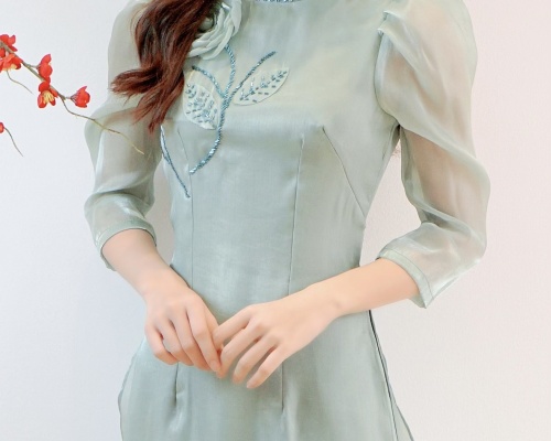 Áo Dài Xanh Ngọc Cổ Xéo Kết Hoa
