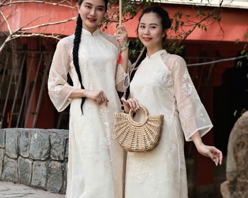 Áo dài voan kem thêu hoạ tiết 4 tà